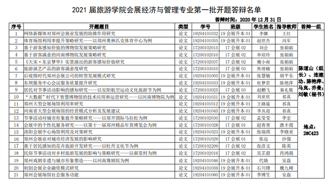 开元集团网站会展经济与管理专业2021届毕业生毕业论文第一批开题答辩将于2020年12月31日15:00在2号楼C423举行,本次开题答辩学生共21人参加,欢迎广大师生观摩指导。