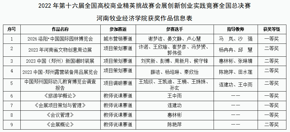 11月26日至28日,由中国国际贸易促进委员会商业行业委员会、中国国际商会商业行业商会、中国商业经济学会和中国会展经济研究会等共同主办的2022年第十六届全国高校商业精英挑战赛会展专业创新创业实践竞赛全国总决赛在线上成功举办。本次竞赛吸引了来自全国28个省、市、自治区和直辖市的466所高校近2600支队伍报名参加。经部分地区省赛、院校推荐选拔、组委会评审,最终有来自全国28个省、市、自治区306所高校1178支参赛队伍,6700多名参赛选手和辅导教师入围全国总决赛。在河南赛区省赛选拔基础上,开元官网推选的5支学生学生团队、4名教师经过文案评审、视频展示、线上答辩等环节均取得优异成绩,其中学生团队一等奖1项,二等奖4项;教师组一等奖3项,二等奖1项。开元官网同时获得优秀组织奖。