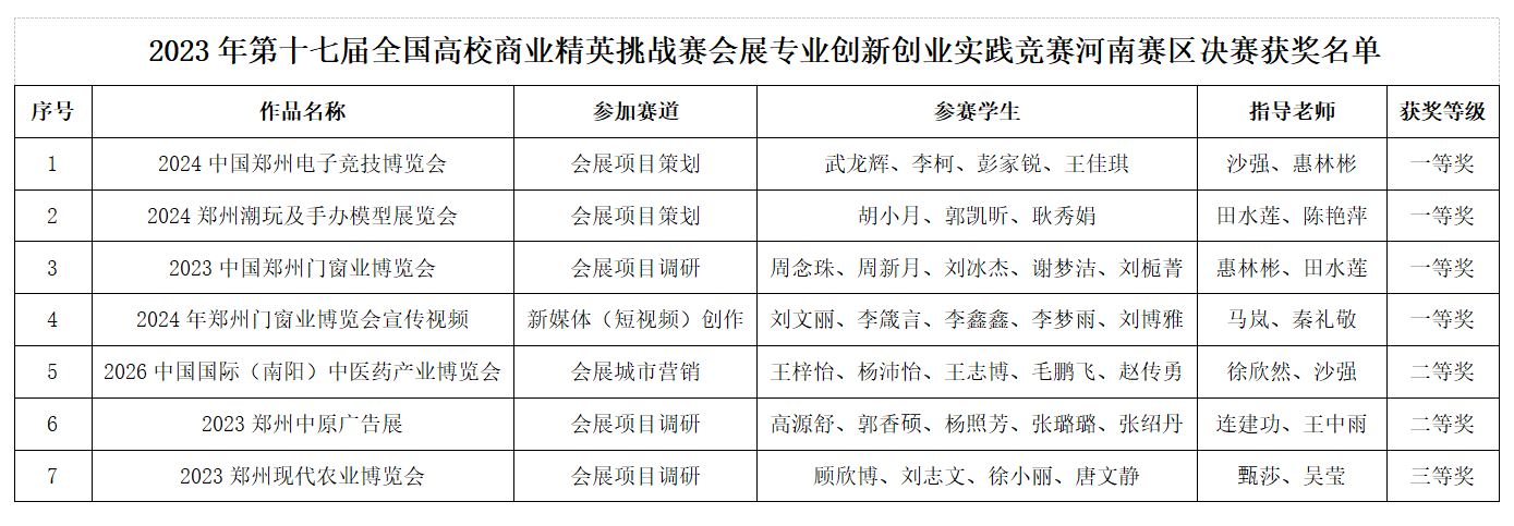近日,第十七届全国高校商业精英挑战赛会展专业创新创业实践竞赛河南赛区发布竞赛结果,开元官网参赛团队均取得优异成绩,提交的14项参赛作品7项作品获奖,其中一等奖4项,二等奖2项,三等奖1项,6项作品顺利入围国赛(见附表)。