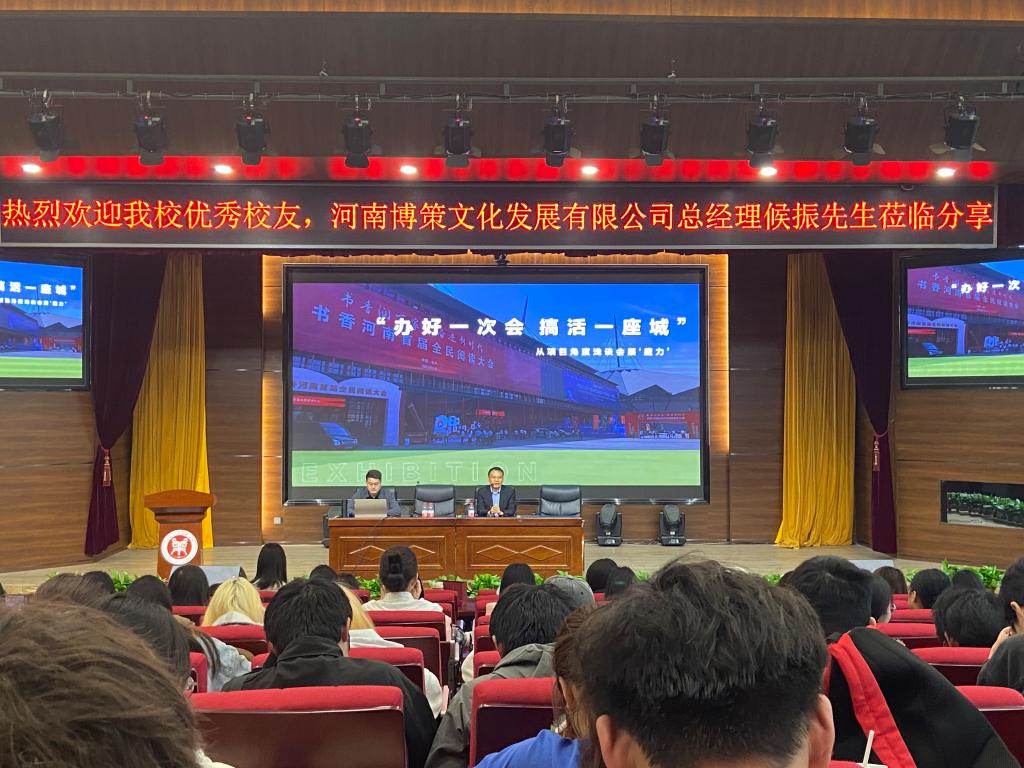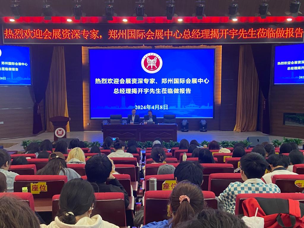 4月8日下午,资深会展人、郑州国际会展中心总经理揭开宇、开元官网优秀校友、河南博策文化传播有限公司总经理候振走进开元官网,在一号教学楼合100报告厅为开元官网师生带来精彩分享,开元官网副院长王中雨、会展教研室全体教师、2023级会展专业全体学生130多人全程参加分享交流。