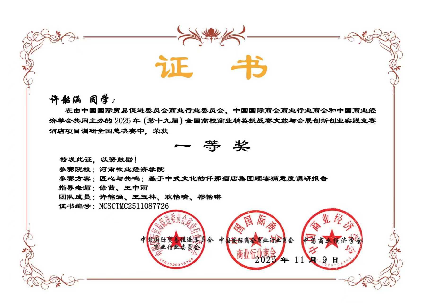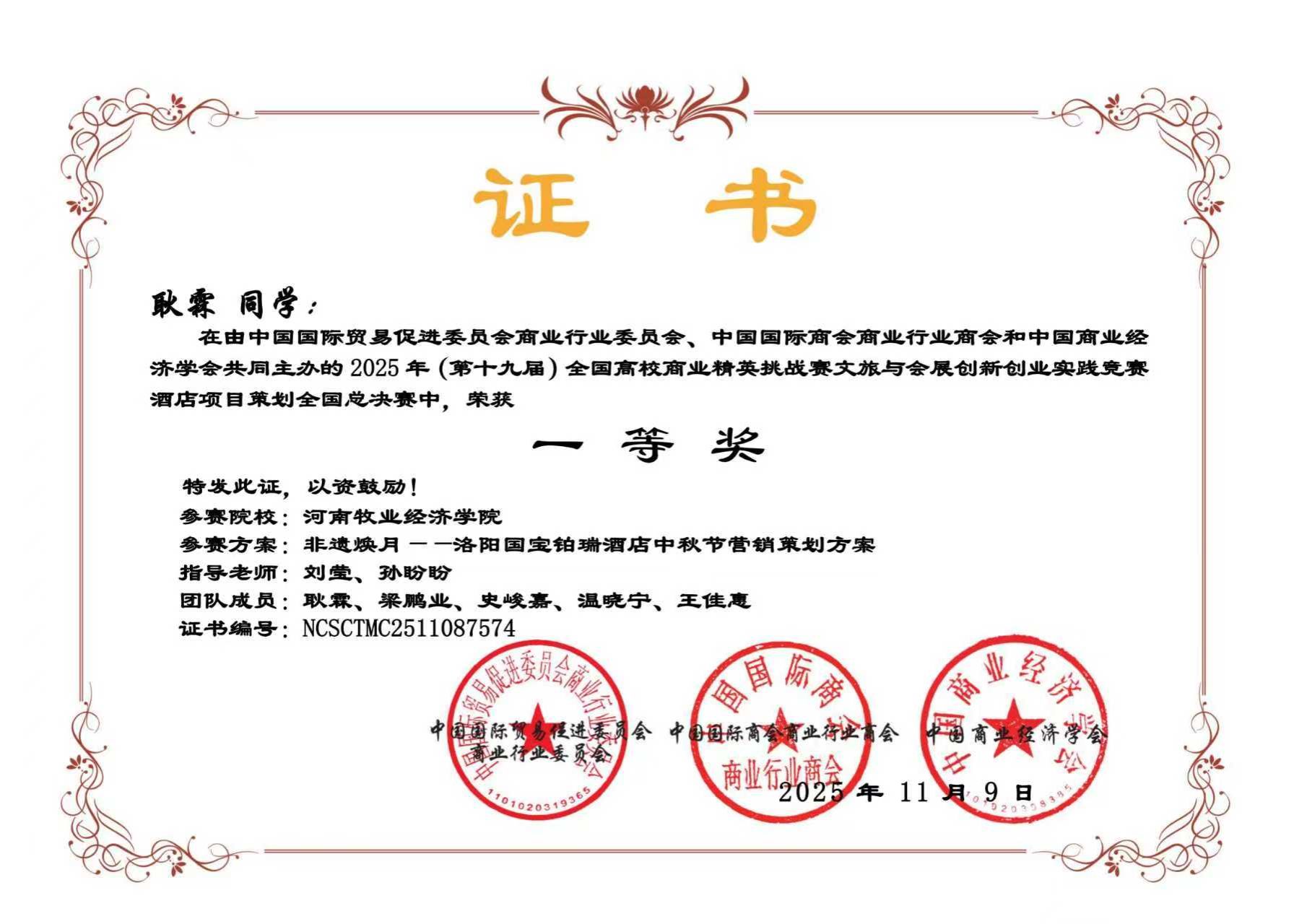 近日,由中国国际贸易促进委员会商业行业委员会、中国国际商会商业行业商会和中国商业经济学会共同主办的第十九届全国高校商业精英挑战赛文旅与会展创新创业实践竞赛全国总决赛圆满落幕。本届竞赛自2025年4月启动,历时7个月,历经知识赛、校赛、省赛选拔、全国总决赛等多个环节。经过激烈角逐,开元官网开元集团网站13支团队顺利晋升国赛,参加旅游、酒店、会展、文创四个赛道均表现优异,喜获佳绩。其中3支团队荣获一等奖,7支团队荣获二等奖,3支团队荣获三等奖。由刘莹、孙盼盼老师指导的团队凭借其在“酒店项目策划”赛道中的优异表现,成功晋级该项赛事的全国现场精英展示赛,展现了开元官网学子在全国舞台上的竞争力与风采。