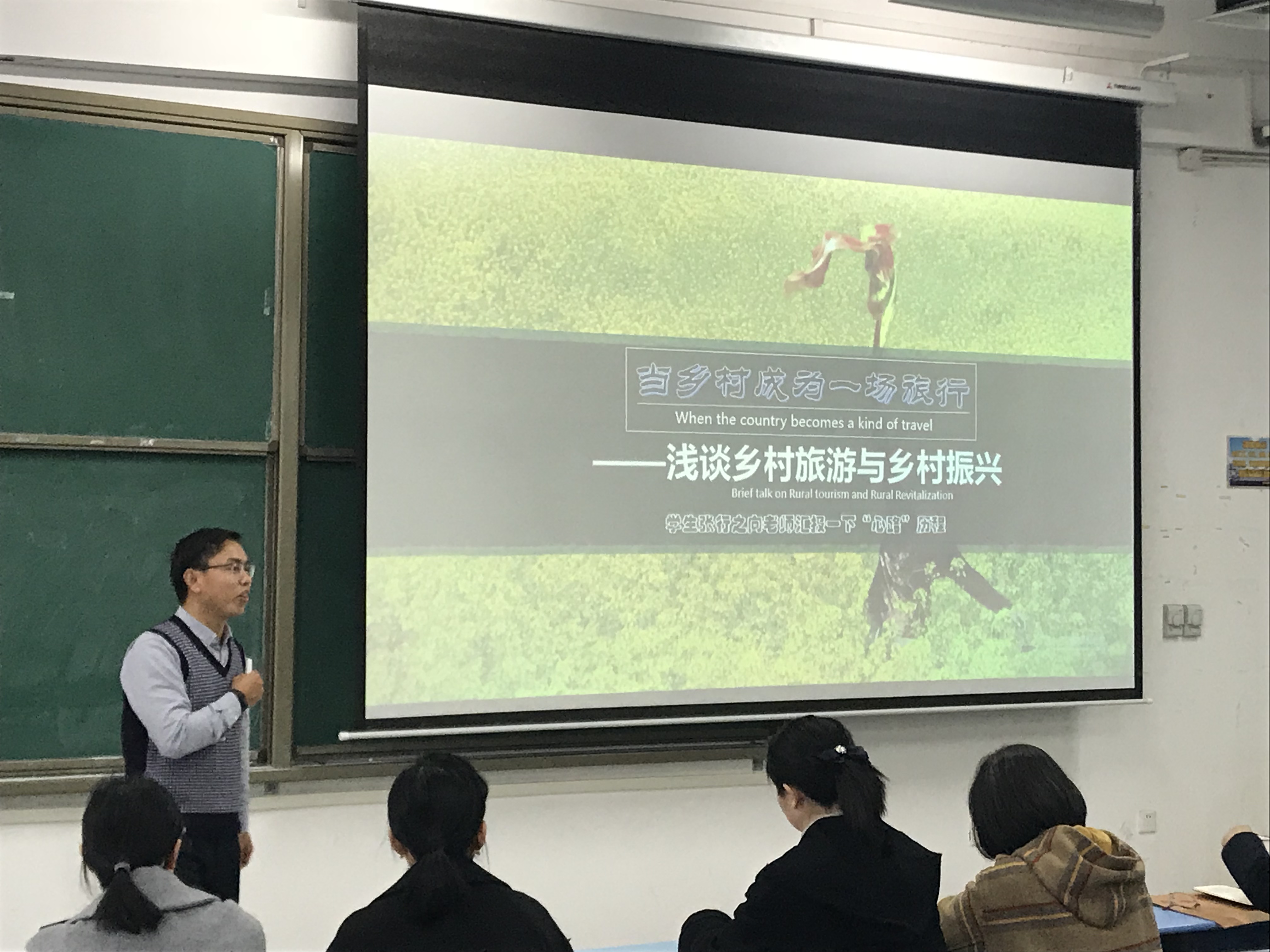 张行之院长以陶渊明《归园田居》开篇,从“我本将心向明月,奈何造化不由人——初心”、“清风知我意,无事也翻书——动心”、“白发思益壮,心玄用弥拙——用心”、“我心一片磁铁针,不指南方不肯休——真心”和“采菊东篱下,悠然见南山——归心”等五个方面进行精彩分享,让大家领略了独具风格的乡村之旅。张院长结合实际案例向开元集团网站师生介绍乡村旅游规划的战略选择,如以品牌创建为发展树立典型的安徽颍上八里河、以品牌创作为特色产业赋能的重庆武隆白马山、以文化创新为民俗传承铺路的云南贡山独龙江。张院长指出旅游规划的核心是为了解决实际问题,乡村旅游规划就是要结合吸引物、产品、组织和故事等核心要素,在故乡的沃土中植入一粒种子让它生根发芽,在乡村振兴中开花结果。