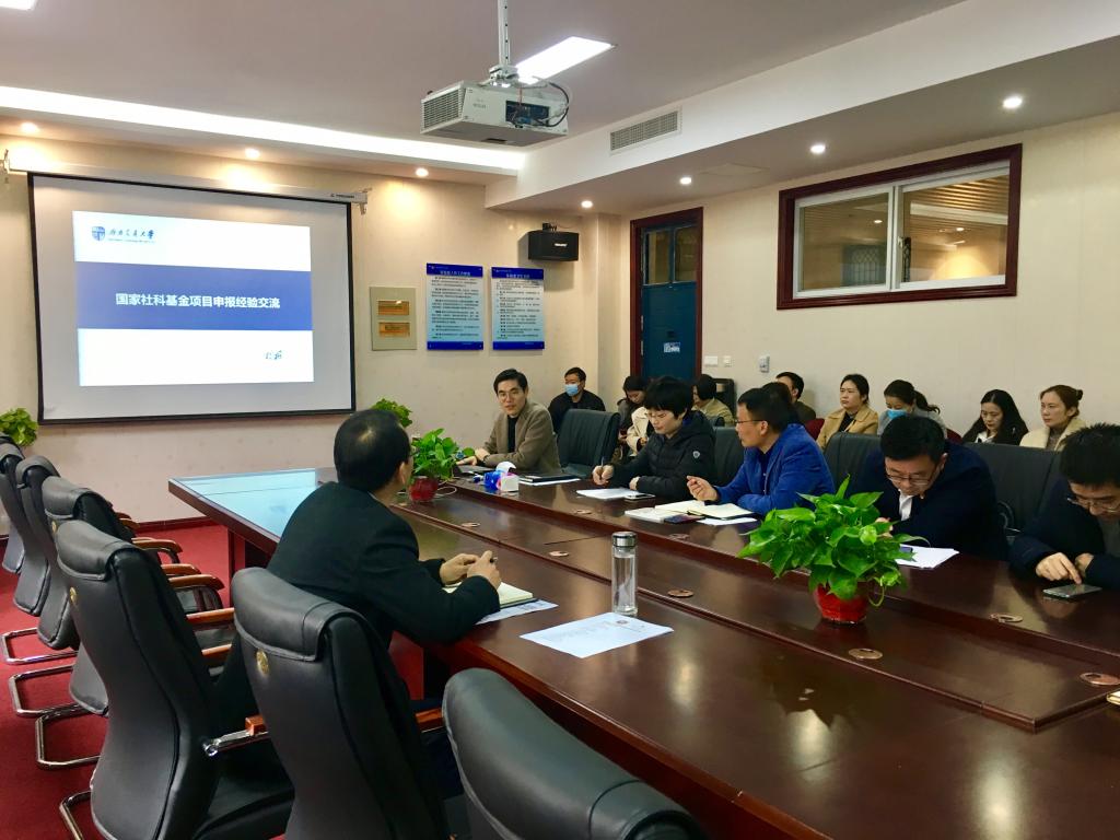 会中,杨教授针对国家社会基金申报的相关要求,从选题建议、课题设计论证及注意事项等三个方面进行分享交流。首先强调选题一定要结合指南,紧跟国家时事热点、选择社会民生问题,要研究实践中的真问题,并能结合实际情况适当突出地方性、民族性及学科特点;其次,针对课题论证的内容所涉及的选题依据、研究内容、创新之处、预期成果及参考文献等撰写给出详细建议,他强调选题依据一定要分析研究现状,结合国家政策,突出研究价值;文献综述是对研究现状进行总结,并在前人的基础上提出自己的见解和研究思路而写成的文体,是开展研究的基础和起点,不是文献的简单堆砌,是对现有研究成果的“综”、“述”、“评”;研究内容要目标清晰、指向明确、直奔主题,研究计划要时间合理、阶段分明、安排细致。杨教授强调项目申报材料一定要总体框架思路清晰、内容精炼、格式精美、重点突出、重在坚持。