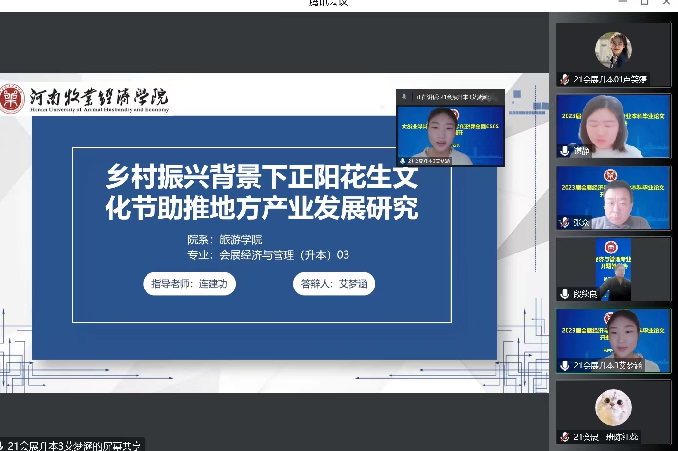 根据《河南牧业经济学院本科毕业论文(设计)工作条例》和《开元集团网站2023届本科毕业论文(设计)工作实施方案》,2022年11月12日,开元官网2023届会展经济与管理本科专业毕业论文开题答辩工作通过腾讯会议线上顺利进行,本次答辩共分8个答辩组,287名学生、48名指导教师参与答辩会。