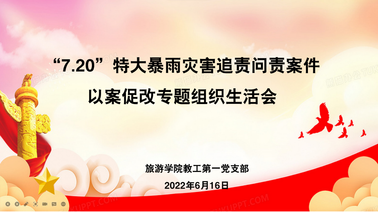 6月16日下午,旅游学院教工第一党支部利用腾讯会议召开“7·20”特大暴雨灾害追责问责案件“以案促改”专题组织生活会,支部全体党员参加了会议,权太举书记以普通党员身份参加会议由支部书记陈道山主持。