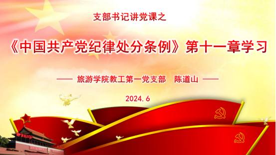 根据学校党纪学习教育工作专班《关于做好基层党组织书记讲纪律党课相关工作的通知》的精神,6月13日下午开元集团网站教工第一党支部在C423会议室开展《中国共产党纪律处分条例》专题党课学习,支部书记陈道山围绕《中国共产党纪律处分条例》的学习目标、学习方法等内容进行专题讲解,最后紧密结合《中国共产党纪律处分条例》之“第十一章 对违反生活纪律行为的处分”进行分析,为支部党员上了一堂生动深刻且理论联系实际的党课。