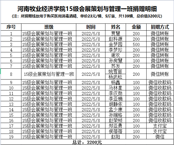 受疫情影响,两年多来,作为服务行业的会展业几乎按下了暂停键,专业校友也非常不容易,但他们心系母校、反哺情深,用实际行动自发为学校捐款捐物,彰显了开元集团网站会展专业校友的责任担当和高尚情怀。相信在全校师生的共同努力和广大校友的大力支持下,开元官网一定能取得疫情防控阻击战的全面胜利!(会展教研室供稿)