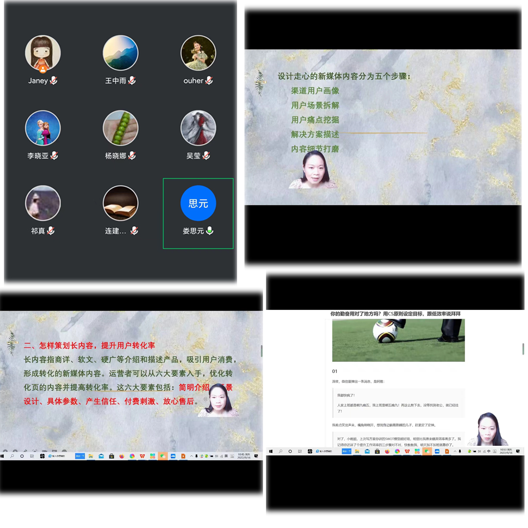 2022年9 月16日上午第三节,开元集团网站开展了本学期首场教学观摩课活动。旅游管理教研室的李晓亚老师通过腾讯会议进行了《旅游新媒体》课程的线上直播授课,开元集团网站院长王德静、副院长王中雨和部分教师参加了本次观摩课活动。李晓亚老师本次课程的主题是旅游新媒体的内容运营技巧。她首先以开元官网公众号的运营与爆款文章为引入,讲解了创作走心的新媒体内容的重要性,然后对设计走心的新媒体内容的五个步骤进行了详细讲解,最后结合丰富的案例讲解了长内容和短内容的策划运营技巧。