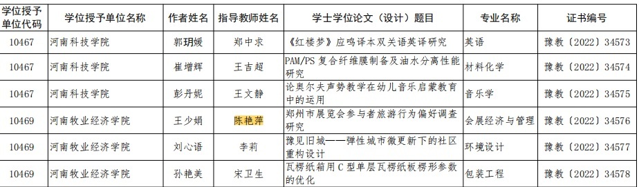 近日,河南省教育厅、河南省学位委员会联合下发了《关于批准2021年河南省优秀学位论文的决定》(教研〔2022〕295号),开元官网会展经济与管理专业陈艳萍老师指导的《郑州市展览会参与者旅游行为偏好调查研究》学士学位论文被评为省级优秀学士学位论文。