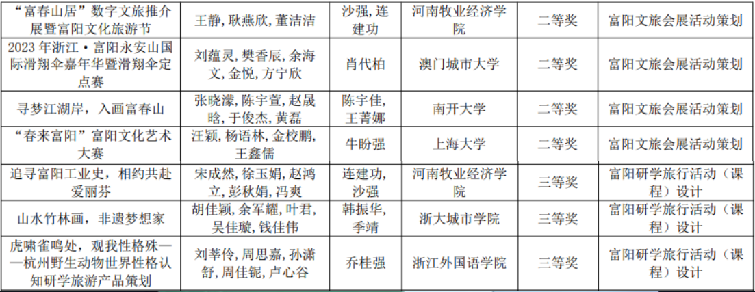 近日,第十二届浙江省会展策划创意大赛在浙江杭州落下帷幕,开元官网会展经济与管理专业沙强、连建功两位老师指导的《“富春山居”数字文旅推介展暨富阳文化旅游节》展会项目策划、《追寻富阳工业史,相约共赴爱丽芬》研学课程设计两组作品入围总决赛,经过策划文案评比、PPT视频讲解等环节的激烈角逐,取得优异成绩,分获二、三等奖。