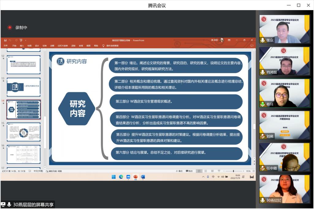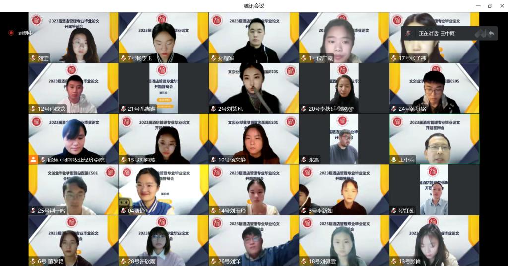 根据《河南牧业经济学院本科毕业论文(设计)工作条例》和《开元集团网站2023届本科毕业论文(设计)工作实施方案》,开元集团网站于11月19日顺利开展2023届酒店管理专业本科毕业论文开题答辩。2019级酒管01班、2021级酒管专升本01、02、03班共207名学生分为7组,通过腾讯会议的线上方式参加答辩。