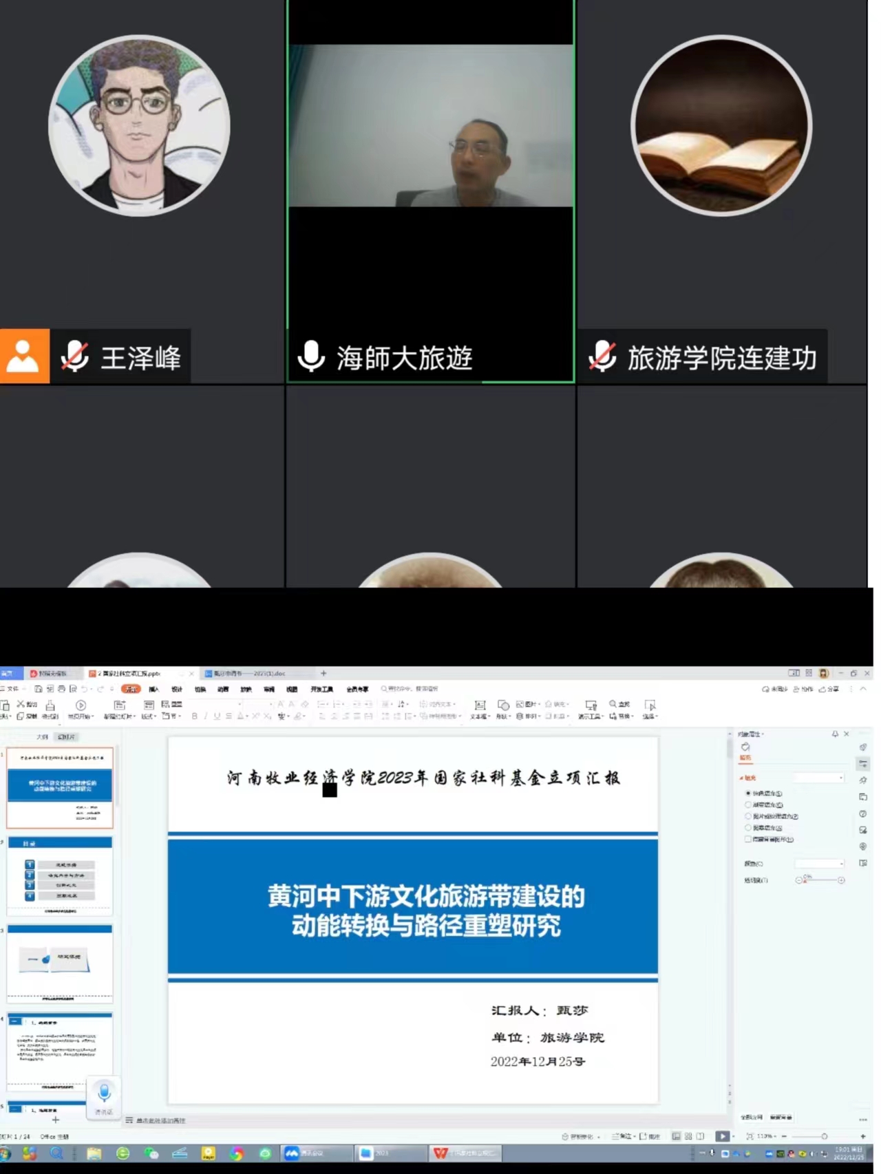 2022年12月25日晚上19:00,开元集团网站通过线上会议进行了2023年国家社科基金项目申报首场论证会。本次论证会邀请海南师范大学开元集团网站副院长、河南大学商学院旅游管理博士生导师李锋教授在线点评与辅导。学院教研室主任、专任教师、博士们参加了本次论证交流会,会议由副院长陈道山主持。