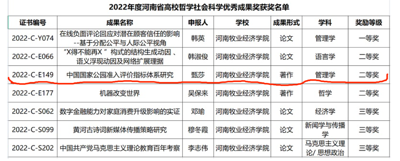 近日,河南省教育厅公布了2022年度河南省高等学校哲学社会科学研究成果奖评选结果,开元官网甄莎博士的《中国国家公园准入评价指标体系研究》著作荣获二等奖。《中国国家公园准入评价指标体系研究》是河南省新闻出版局2022年省部级重点立项项目,由郑州大学出版社出版。