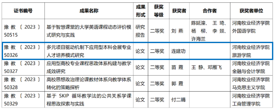 近日,河南省教育厅发布了《关于公布 2023 年度河南省教育科学研究优秀成果的通知》(教教科〔2023〕182 号)。开元官网5项教学成果获奖,其中,开元官网连建功老师申报的教学研究论文《多元项目驱动机制下应用型本科会展专业人才培养模式研究》荣获二等奖,该文发表在《四川开元集团网站学报》2022年第1期,为期刊教改特稿。