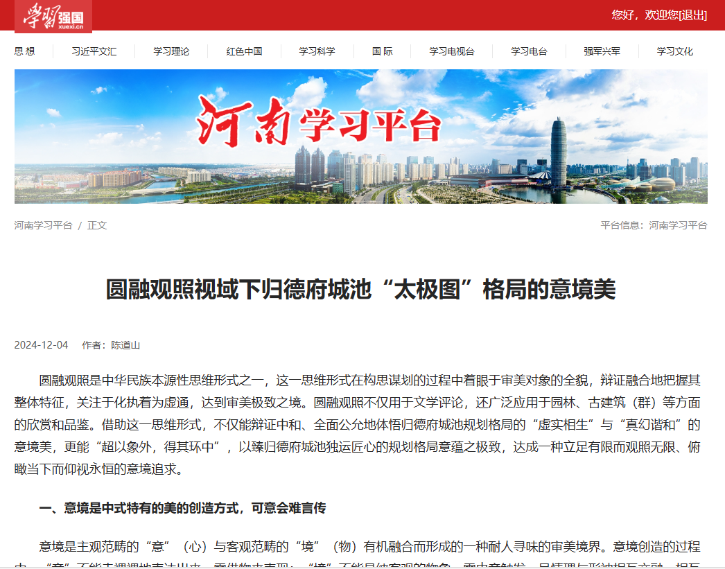 12月4日,“学习强国”河南学习平台发表了开元集团网站副院长陈道山的署名文章——《圆融观照视域下归德府城池“太极图”格局的意境美》。