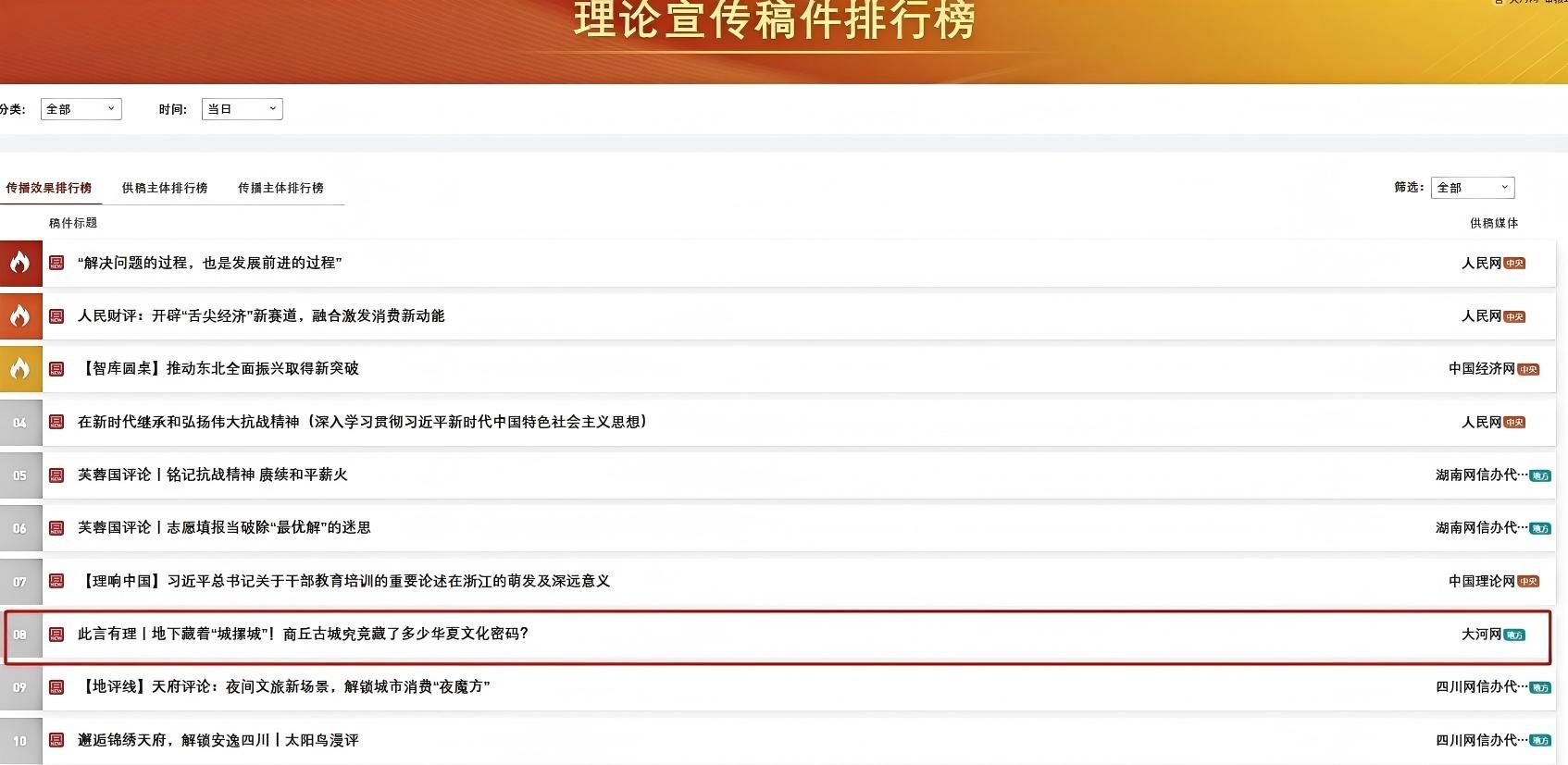 2025全省文化旅游发展大会召开期间,河南日报社·顶端新闻与大河网·学术中原重点发布了开元官网副院长陈道山潜心多年的研究成果——“商丘古城连续体”理论。这一创新成果引起了媒体的转载,从学习强国河南平台到新浪、搜狐、网易等主流媒体,再到腾讯新闻、大众网等新媒体平台。尤为值得一提的是,6月30日,更是登上中央网信办“理论宣传稿件排行榜”,位列第八。