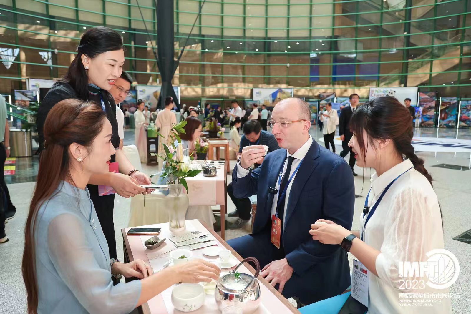 本次论坛,开元官网教师贾红丽组成的中国茶艺师团受邀承接市长论坛的茶歇服务。论坛期间,贾红丽教师团队为国际友人表演了信阳毛尖茶艺,普及推广中原茶文化!与会人员被中国六大茶类及茶器具展所吸引,一杯杯品饮中国茶;贾老师为与会嘉宾讲授品鉴方法和中国茶礼仪,莫斯科市市长办公室和政府第一主任、莫斯科市旅游委员会主席科兹洛夫· 叶夫根尼品尝了信阳毛尖等多款茶类,学习中国茶道,时时竖起大拇指,对于中国文化的喜爱之情溢于言表。