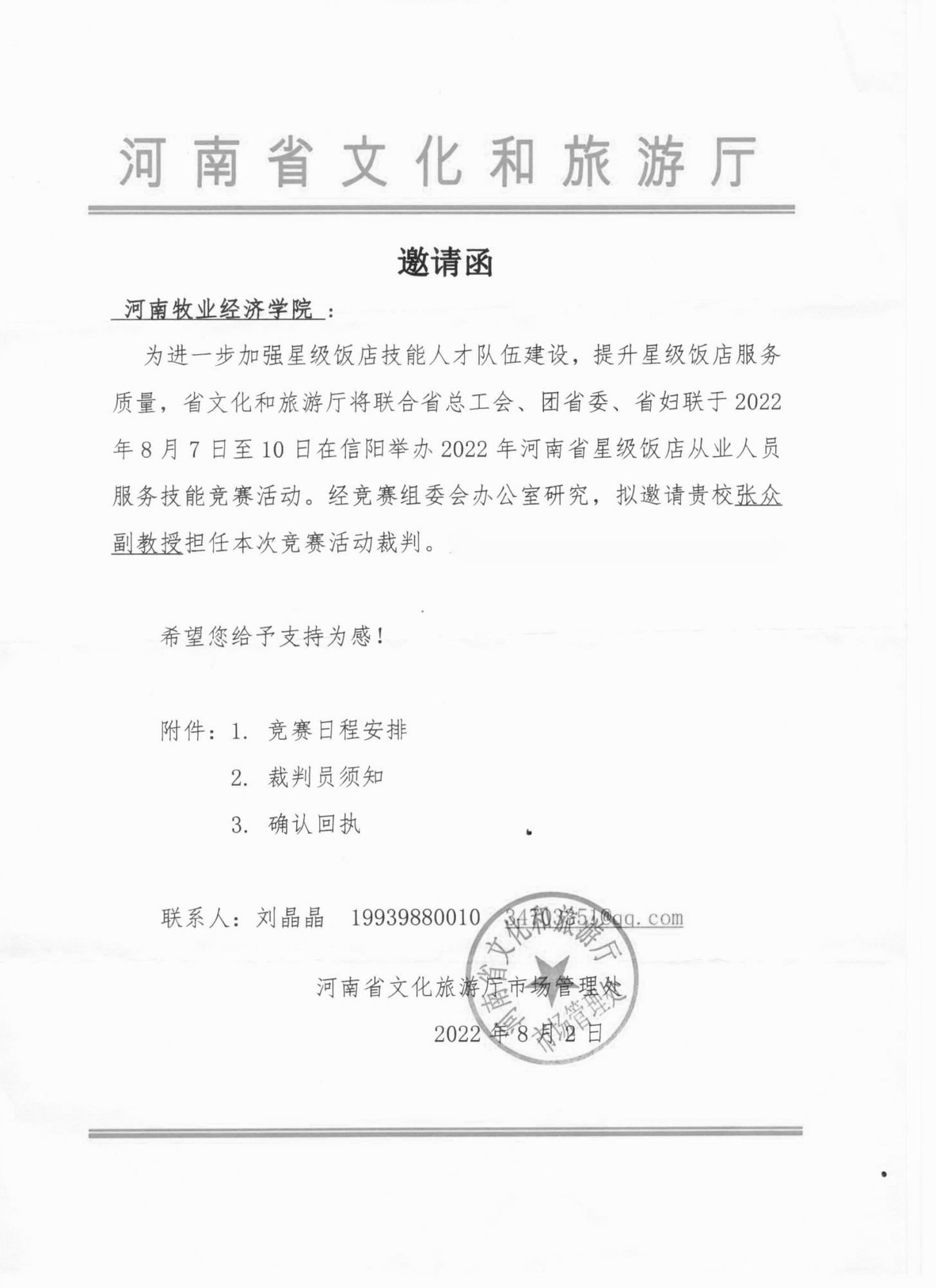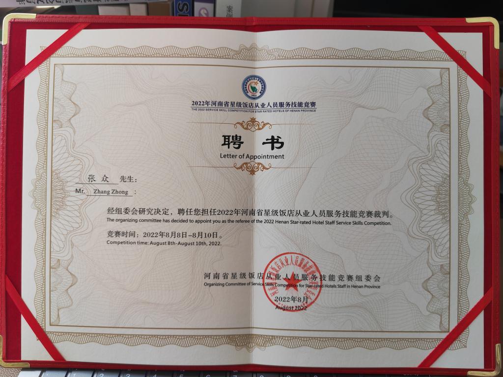 近日,开元官网张众副教授受河南省文化和旅游厅邀请,在刚刚结束的2022年河南省星级饭店从业人员服务技能竞赛中担任裁判员,圆满完成大赛执裁任务。